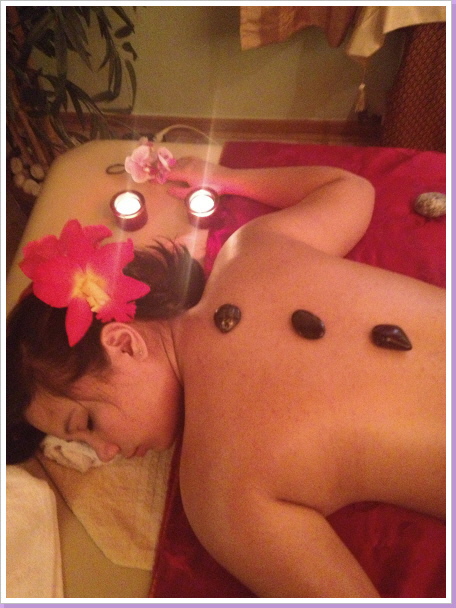 Abgerundete, glatte Lavasteine, auf wohlige Wärme erhitzt, werden entlang der Energielinien auf die Energiepunkte des Körpers gelegt. Die Wärme beginnt sich im gesamten Körper auszubreiten und die Muskulatur entspannt sich. Nun wird der mit Öl eingeriebene Körper mit ebenfalls eingeölten Steinen in kleinen kreisenden Bewegungen massiert.